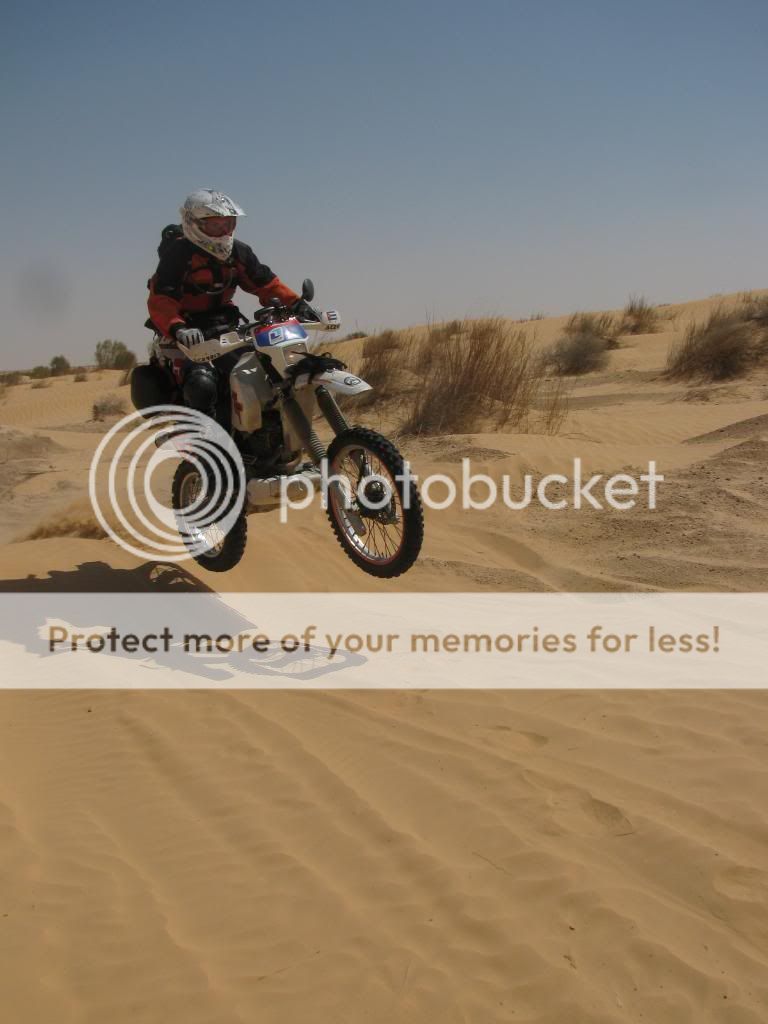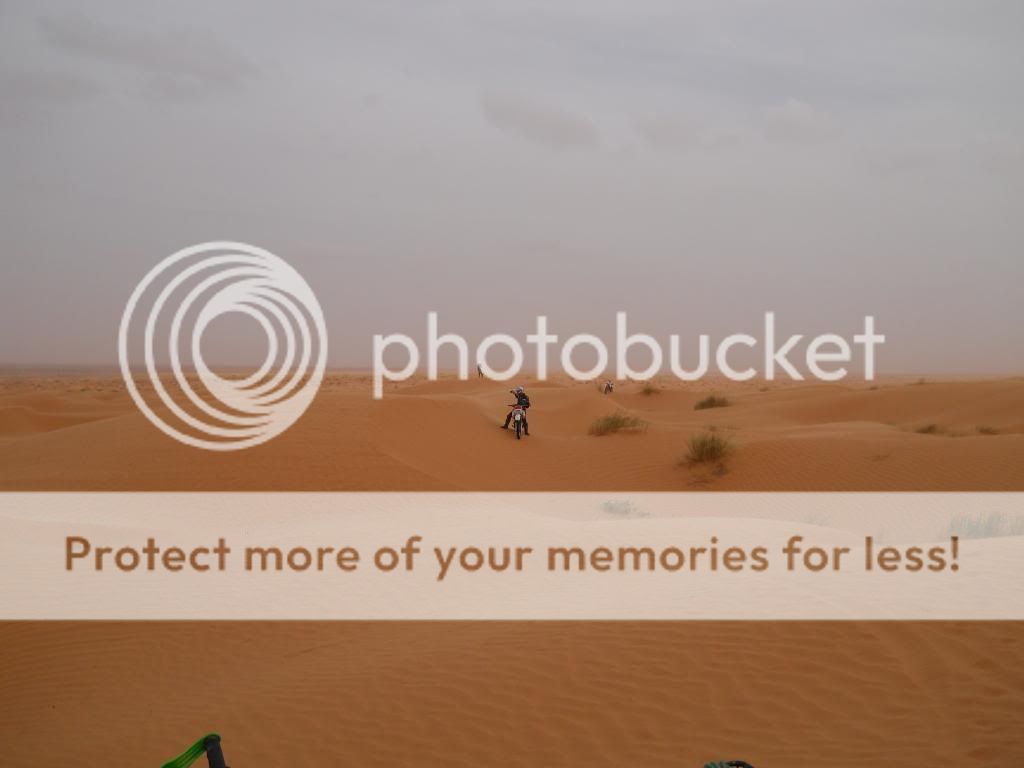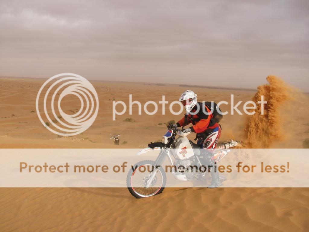 Ed iniziano le danze delle moto, le curve in leggere derapate, l'anteriore che vuole andare per i fatti suoi... ben presto chi non aveva mai provato la guida su sabbia adatta le proprie abitudini al deserto: è lui, il deserto che comanda, maestoso ed immenso, bisogna assecondarlo, non sono i motociclisti a decidere dove andare, è lui che ti porta dove vuole, con improbabili traiettorie, con quell'anteriore che va lasciato fare. Ma mai dargli troppa confidenza, mai sentirsi sicuri: va amato ma rispettato.